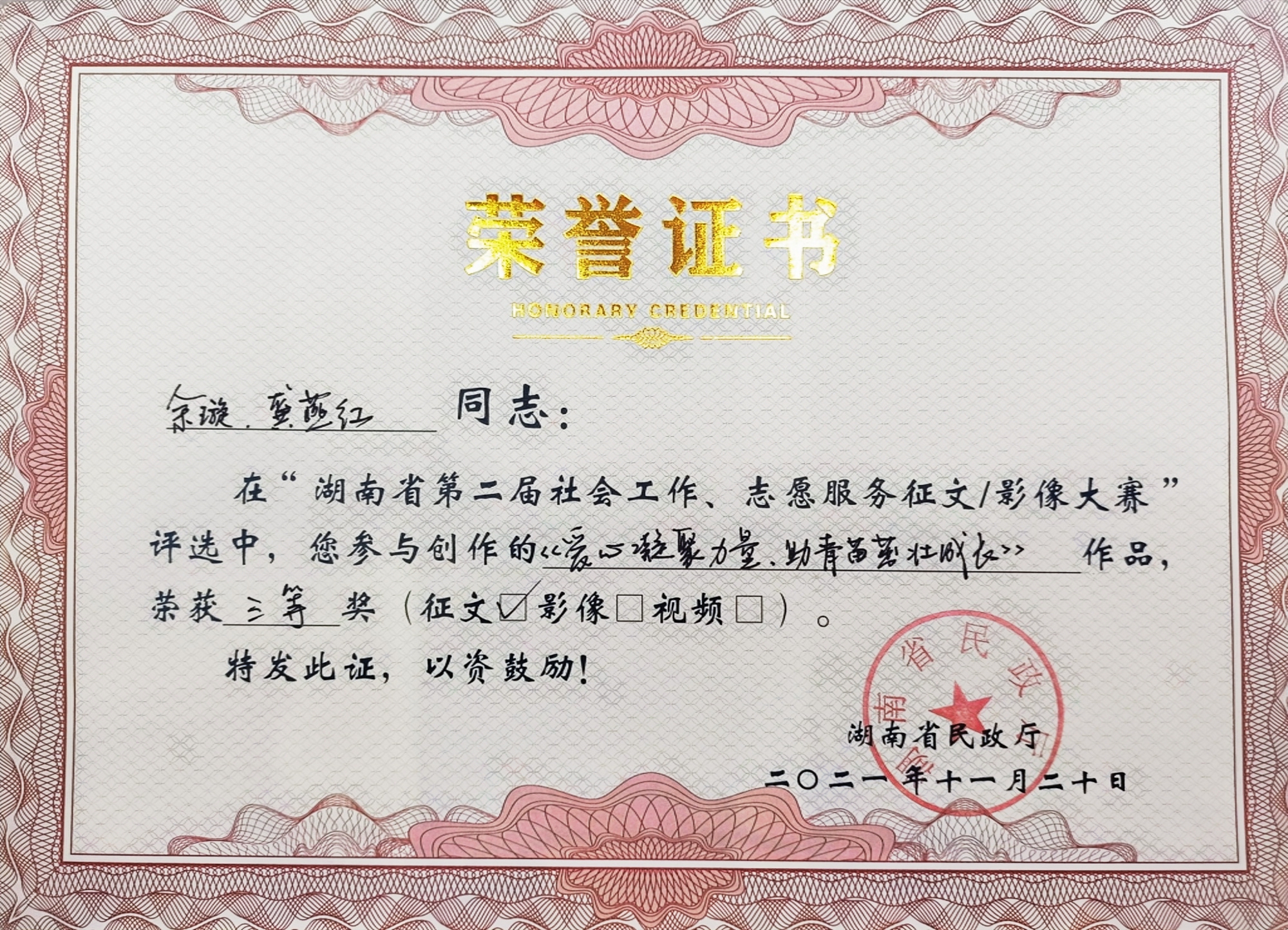 2021年,我司多名員工積極踴躍投稿參與由湖南省民政廳主辦、湖南公共頻道承辦的湖南省第二屆社會工作、志愿服務(wù)征文暨影像大賽。他們講述平凡而偉大的故事,展現(xiàn)社會工作者精神風(fēng)貌,傳播真善美,弘揚正能量。其中兩篇原創(chuàng)征文作品、三幅原創(chuàng)影像作品在比賽中脫穎而出,榮獲一等獎1個、三等獎3個、優(yōu)秀獎1個。